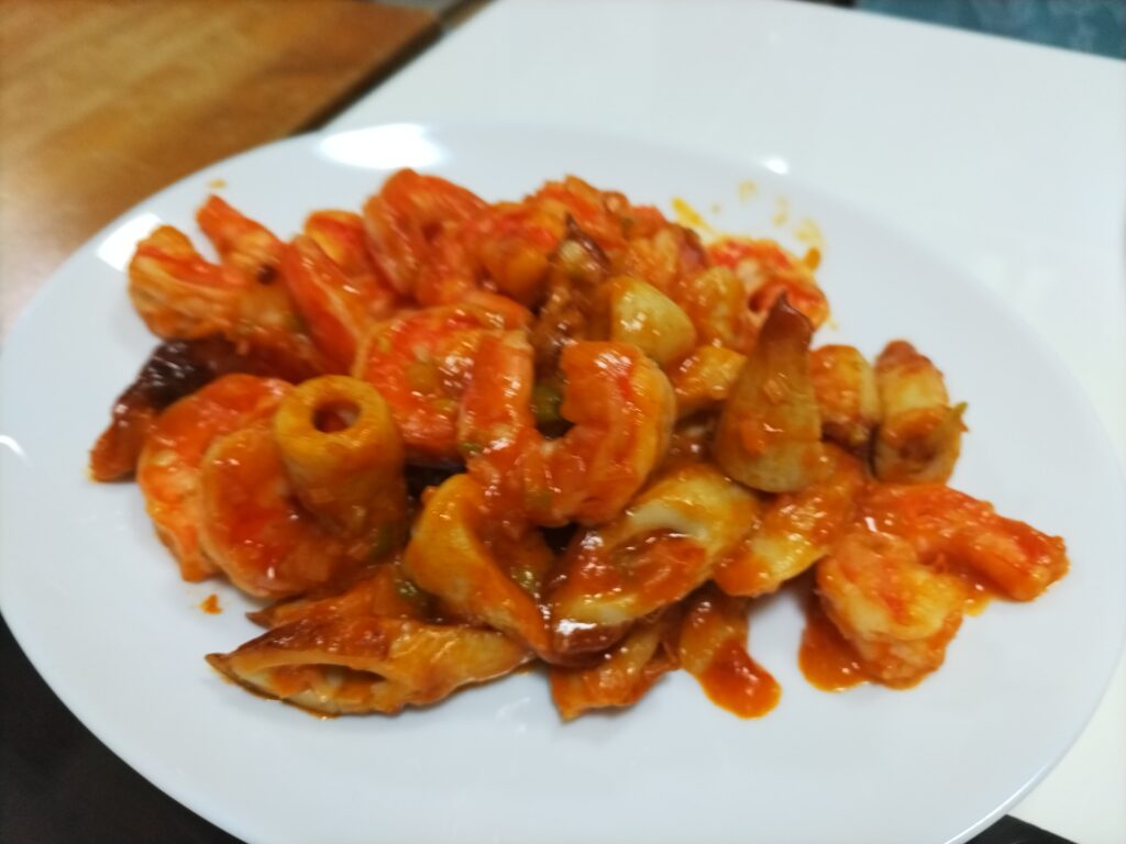 エビチリ 意外とクラッカーとも合う ネギが甘くて美味い 美味しかったです
